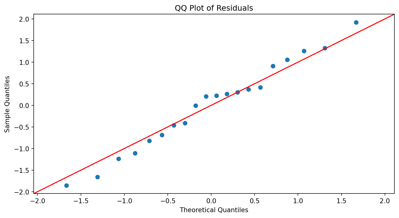 where \(\hat{Y}_i\) is the predicted or fitted value of run time for the \(i\)-th observation, \(i = 1, \ldots, 20\).