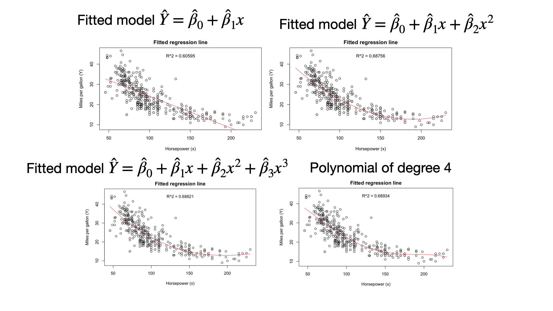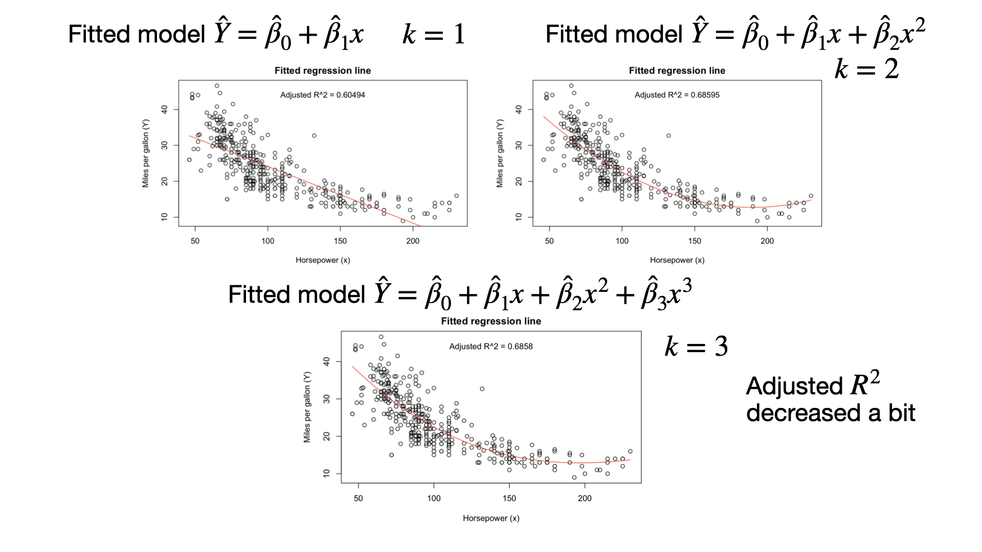 where \(Y_i\) is the mpg, \(X_{i1}\) is the weight, and \(X_{i2}\) is the acceleration of the \(i\)-th car, \(i = 1, \ldots, 392\).