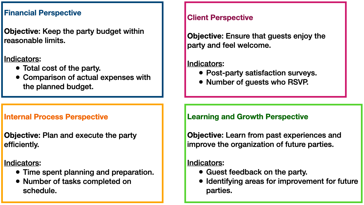 For each objective, one (or more if necessary) metric as a performance indicator