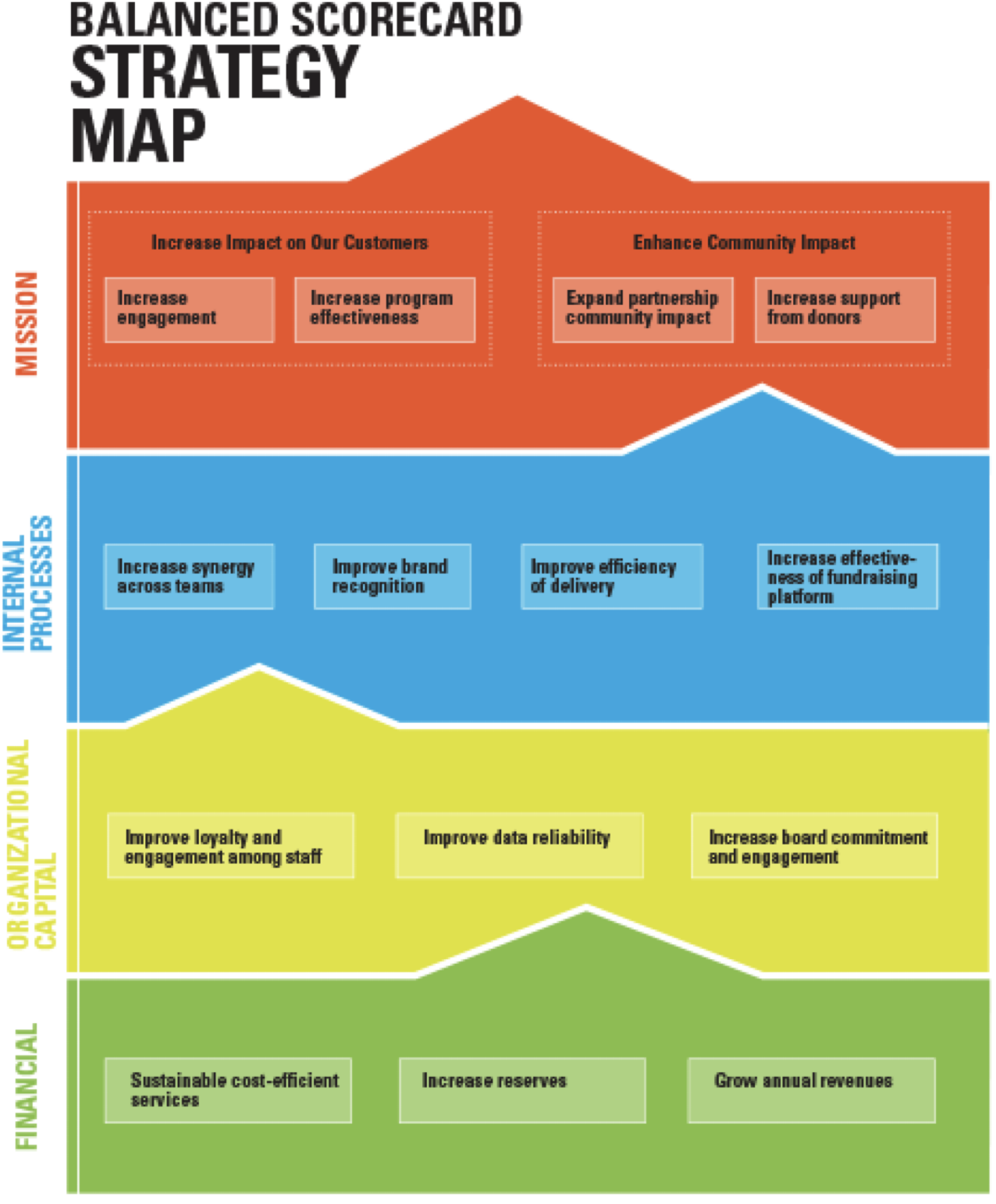 Possible causal relationships between objectives are also shown using arrows.