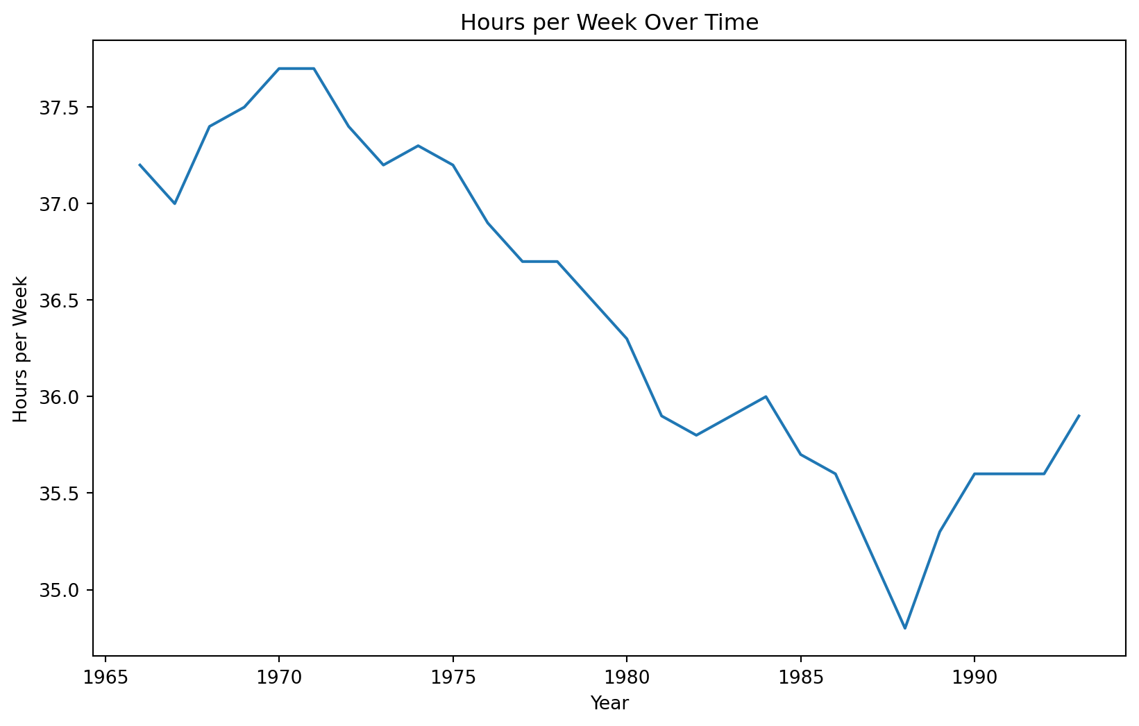 plt.figure(figsize=(10, 6))sns.lineplot(x='Year', y='Hours per Week', data = Canadian_train)plt.xlabel('Year')plt.ylabel('Hours per Week')plt.title('Hours per Week Over Time')plt.show()