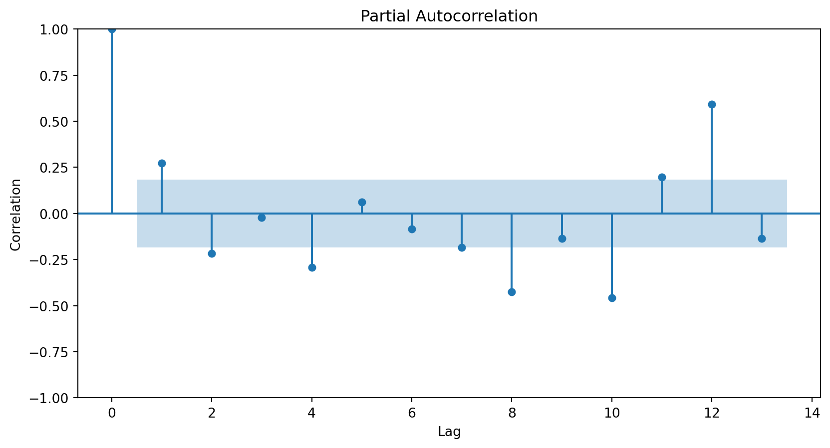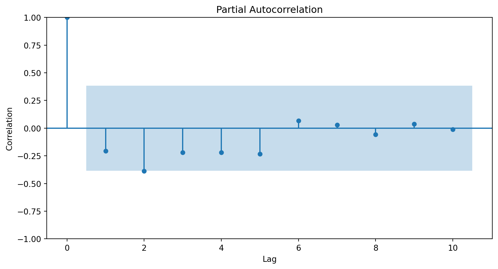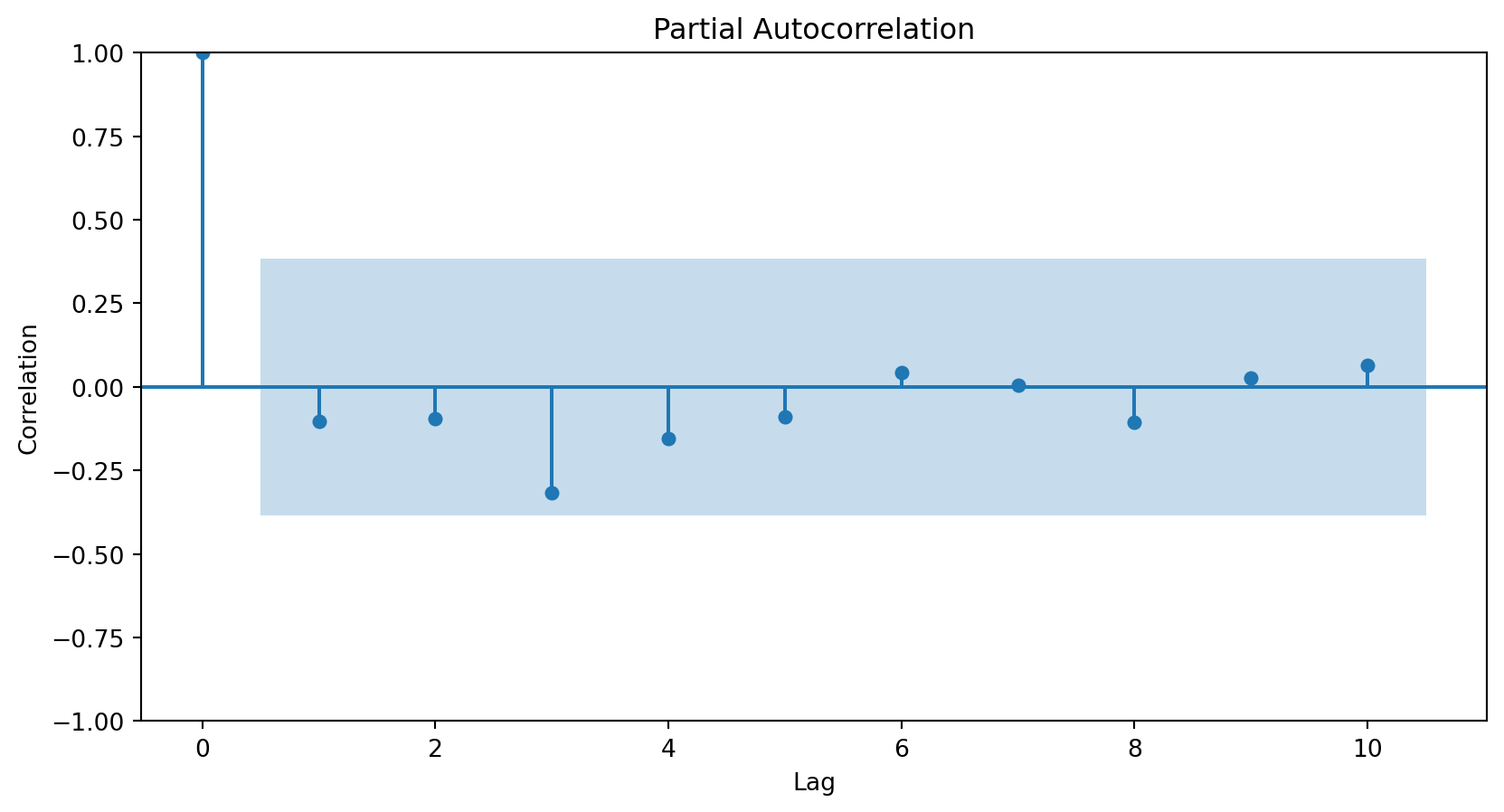 plt.figure(figsize=(10, 6))plot_pacf(Amtrak_data['Ridership (in 000s)'], lags =25)plt.xlabel("Lag")plt.ylabel("Correlation")plt.show()