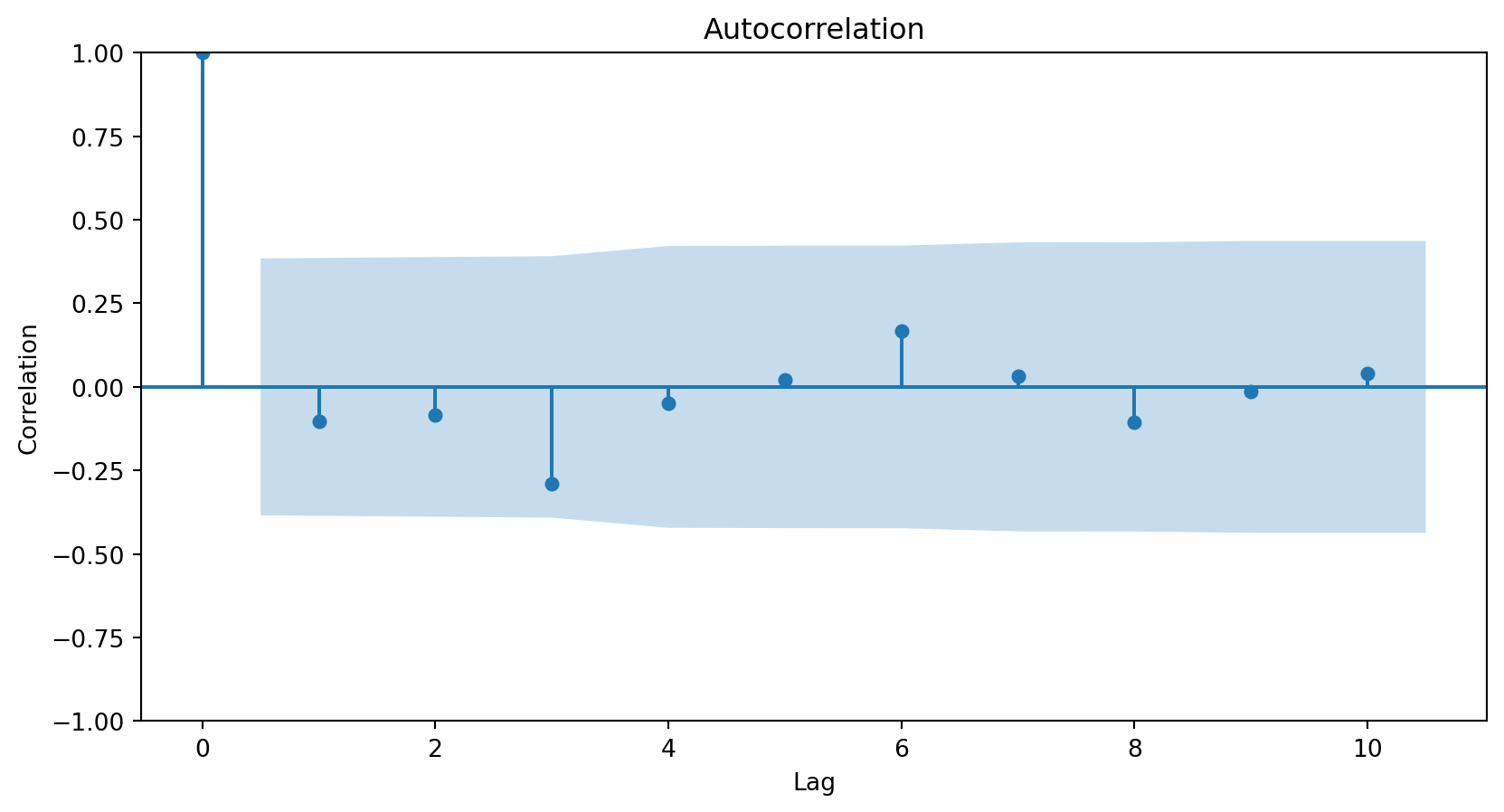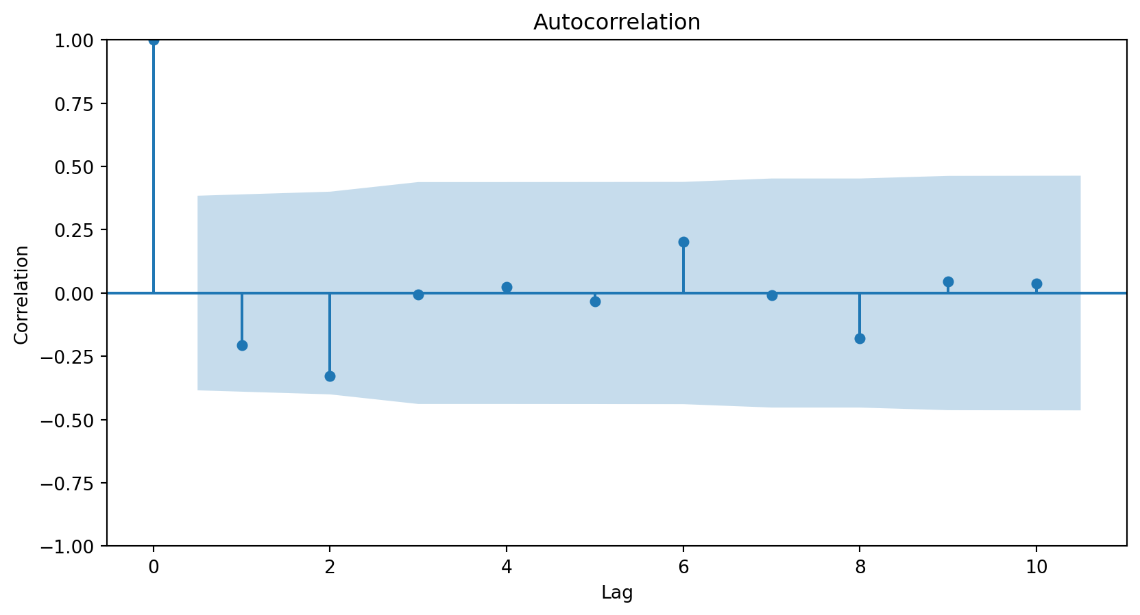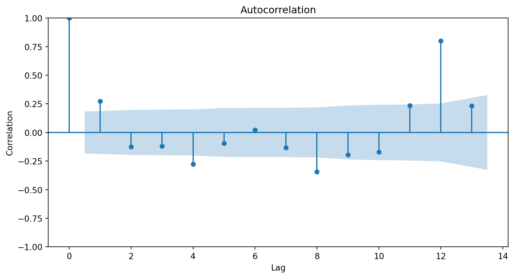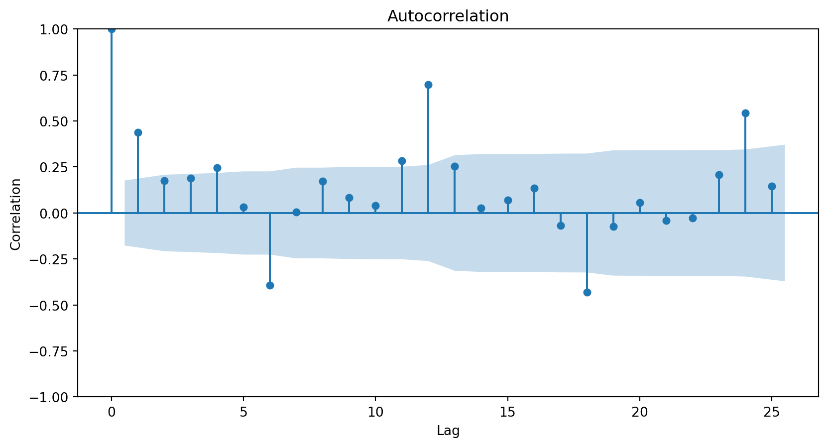 plt.figure(figsize=(10, 6))plot_acf(Amtrak_data['Ridership (in 000s)'], lags =25)plt.xlabel("Lag")plt.ylabel("Correlation")plt.show()