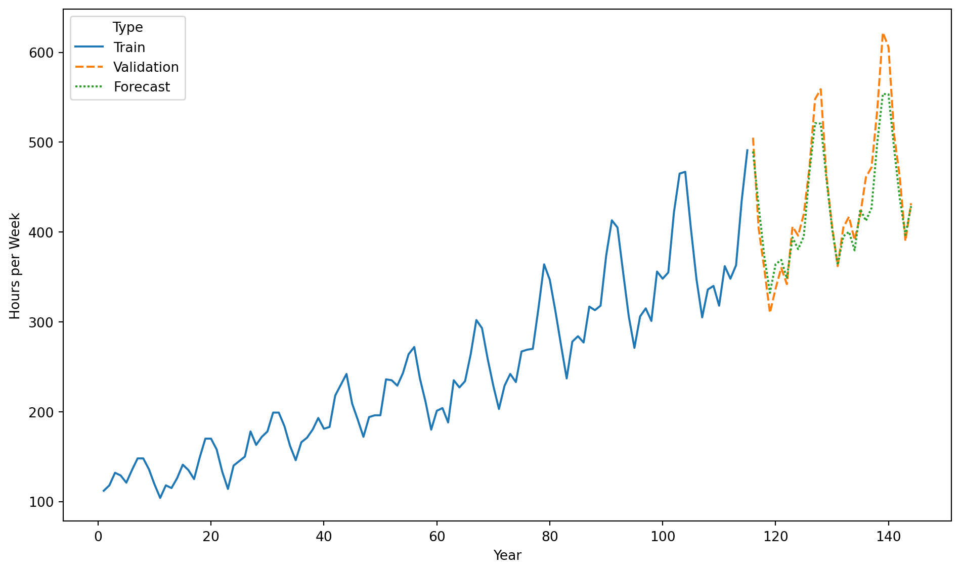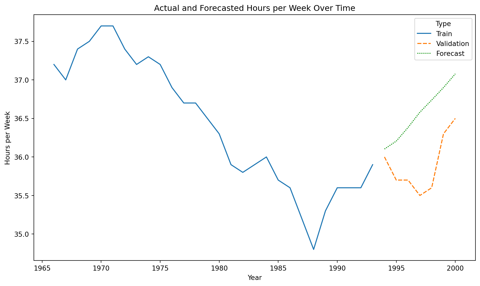# Define the split pointsplit_ratio =0.8# 80% train, 20% testsplit_point =int(len(CanadianWorkHours) * split_ratio)# Split the dataCanadian_train = CanadianWorkHours[:split_point]Canadian_validation = CanadianWorkHours[split_point:]