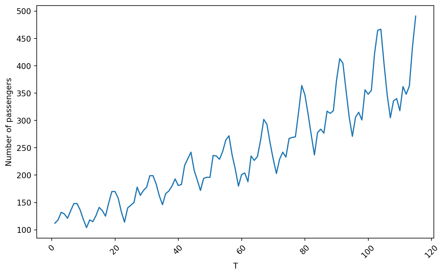 plt.figure(figsize=(8, 5))sns.lineplot(x='T', y='Number of passengers', data = Airline_train)plt.xlabel('T')plt.ylabel('Number of passengers')plt.xticks(rotation=45)plt.tight_layout()plt.show()