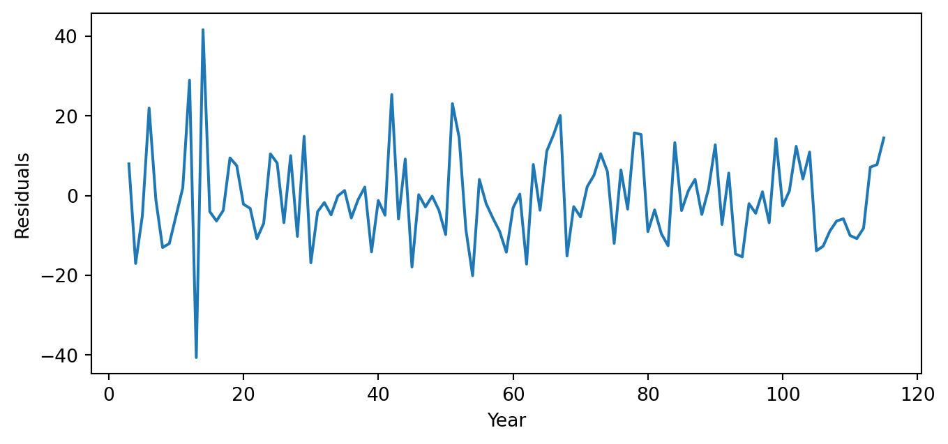 To fit the SARIMA model, we use the ARIMA() function from statsmodels, but with an additional argument, seasonal_order=(0, 0, 0, 0).