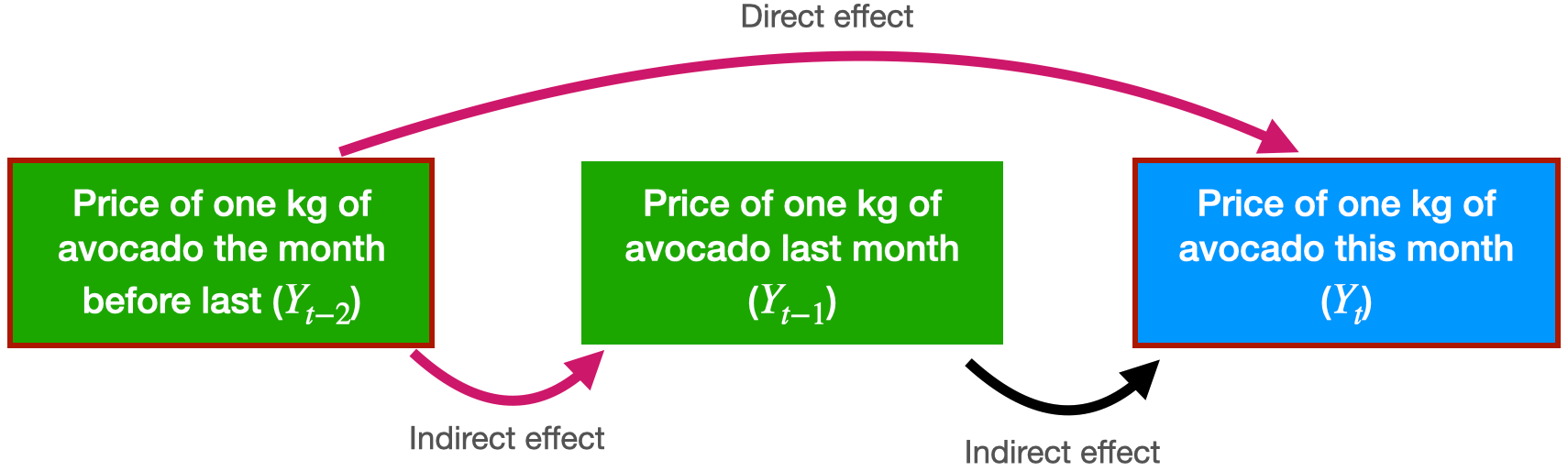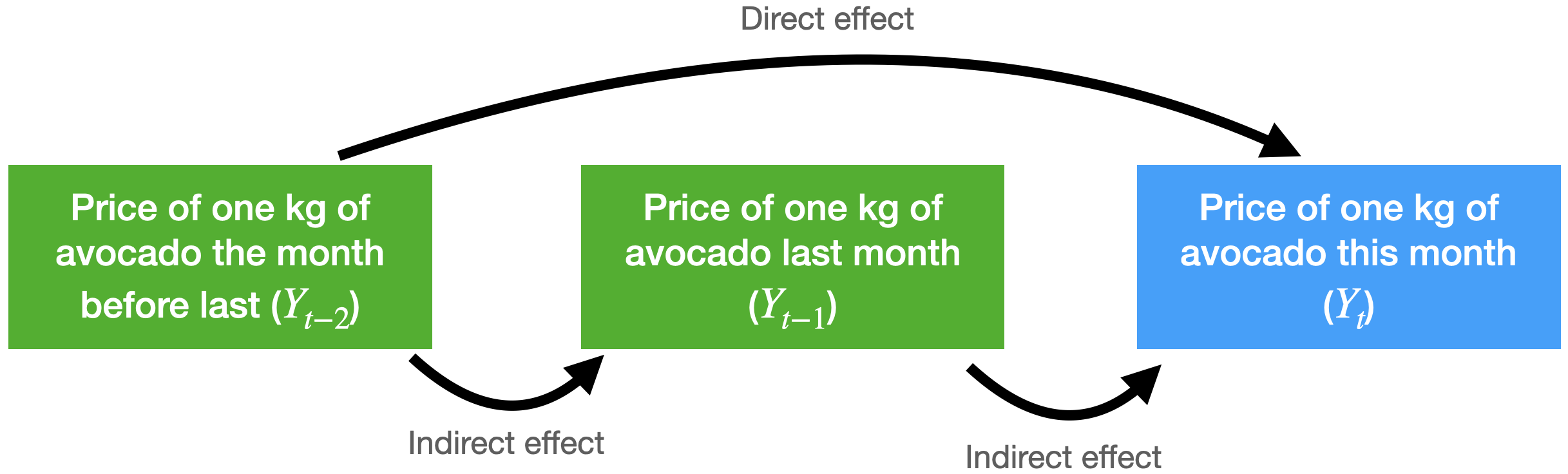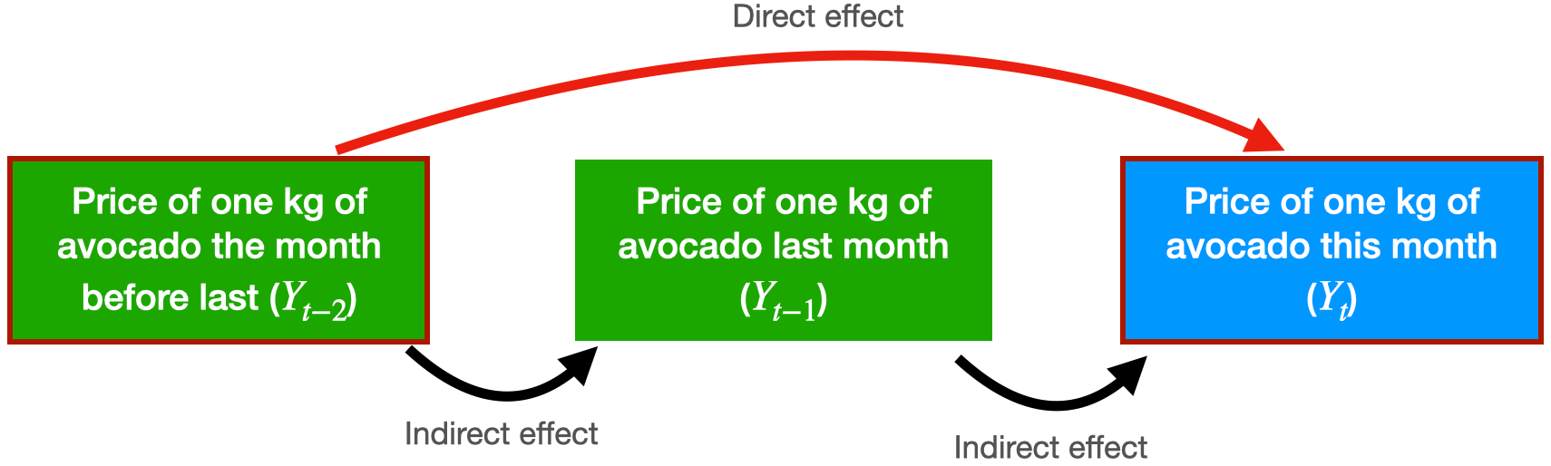 The autocorrelation function for \(Y_t\) and \(Y_{t-2}\) includes the direct and indirect effect of \(Y_{t-2}\) on \(Y_t\).