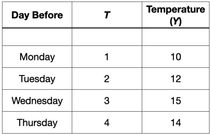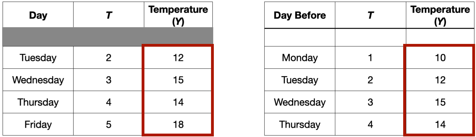 For example, consider the autocorrelation between the current temperature and the temperature recorded the day before. This would be the correlation between these two columns