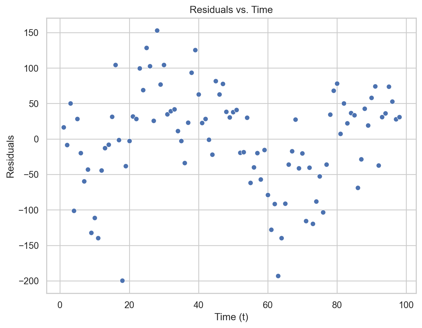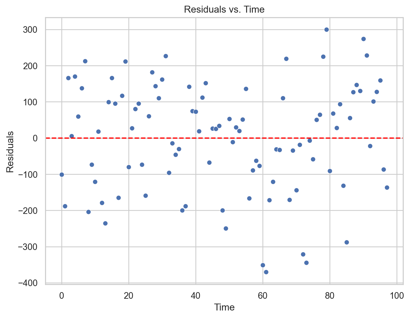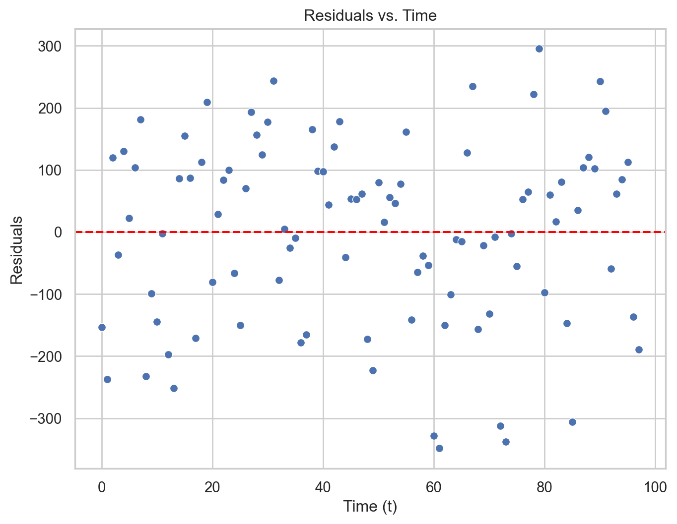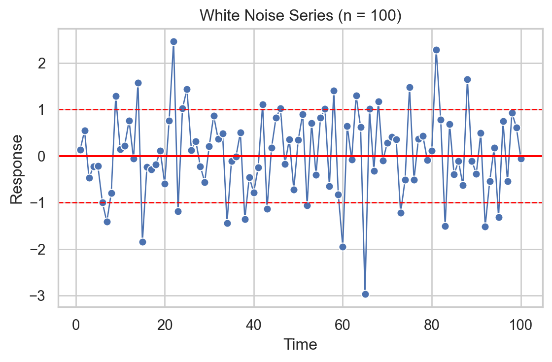In the context of time series, this means that the model errors \(e_i\) must behave like white noise that contains no patterns.