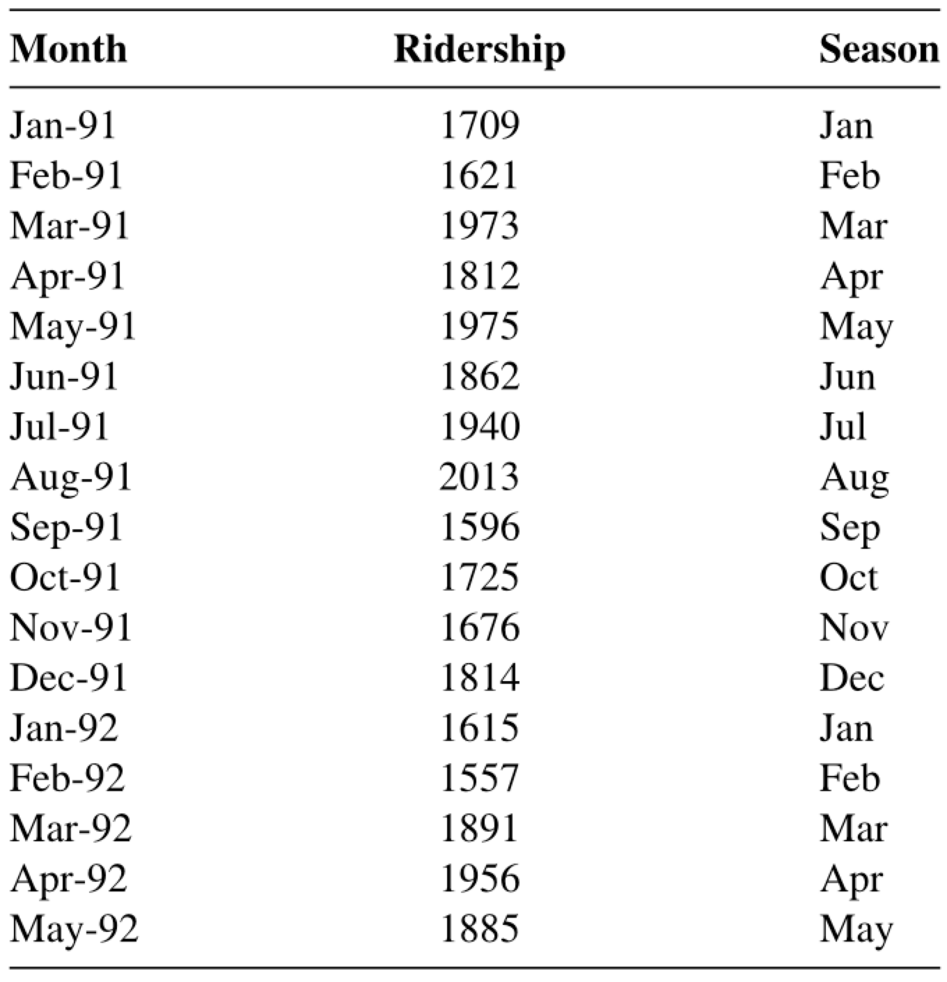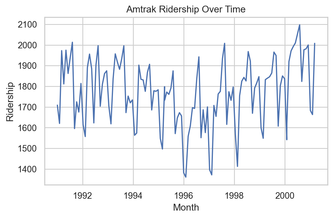 Let’s fit a linear regression model to the ridership data from Amtrak.