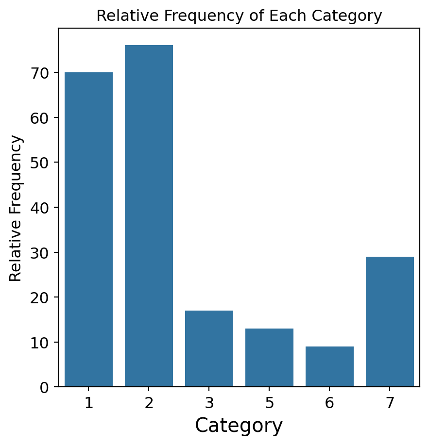 plt.title('Relative Frequency of Each Category', fontsize = 12)