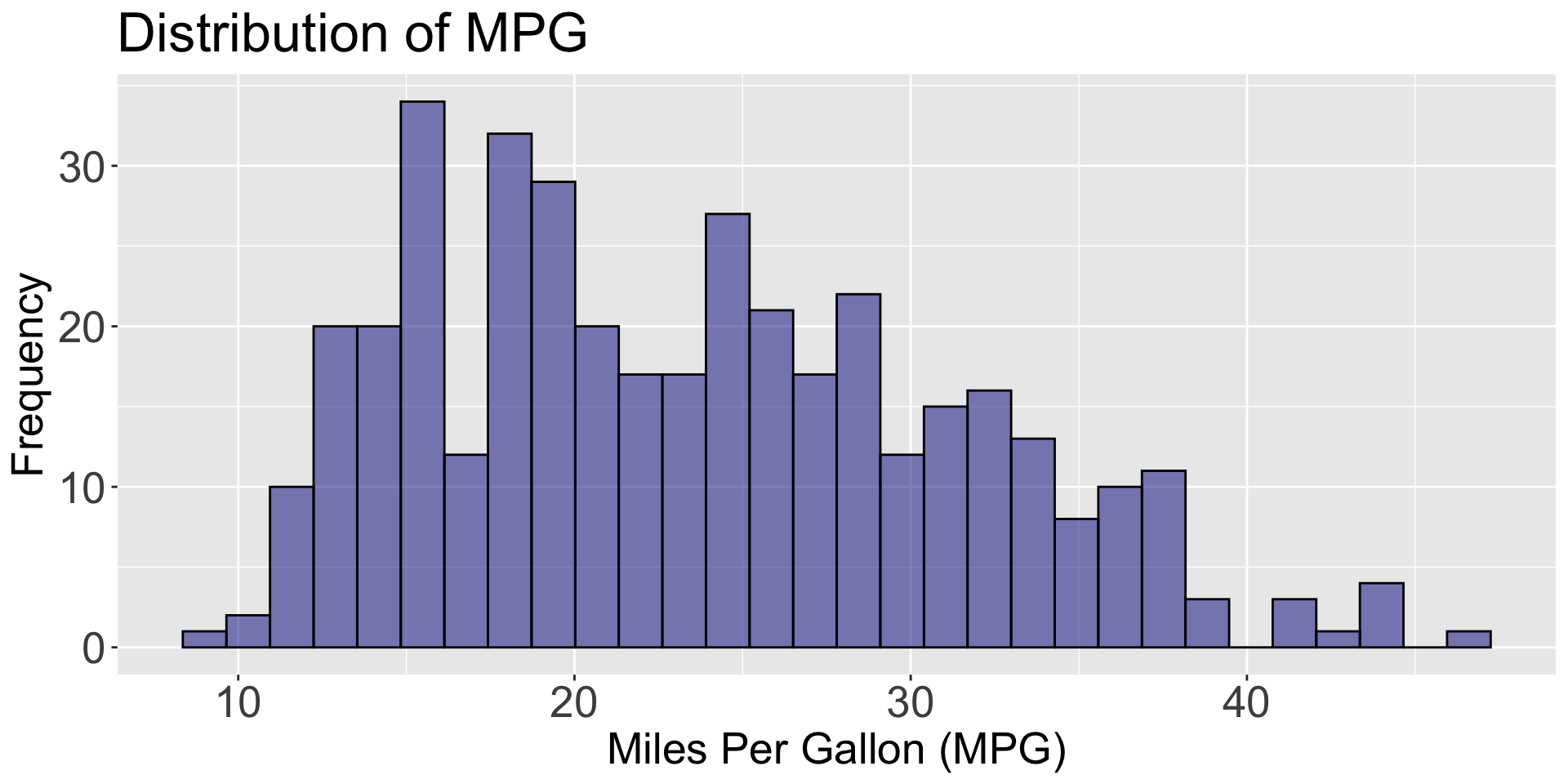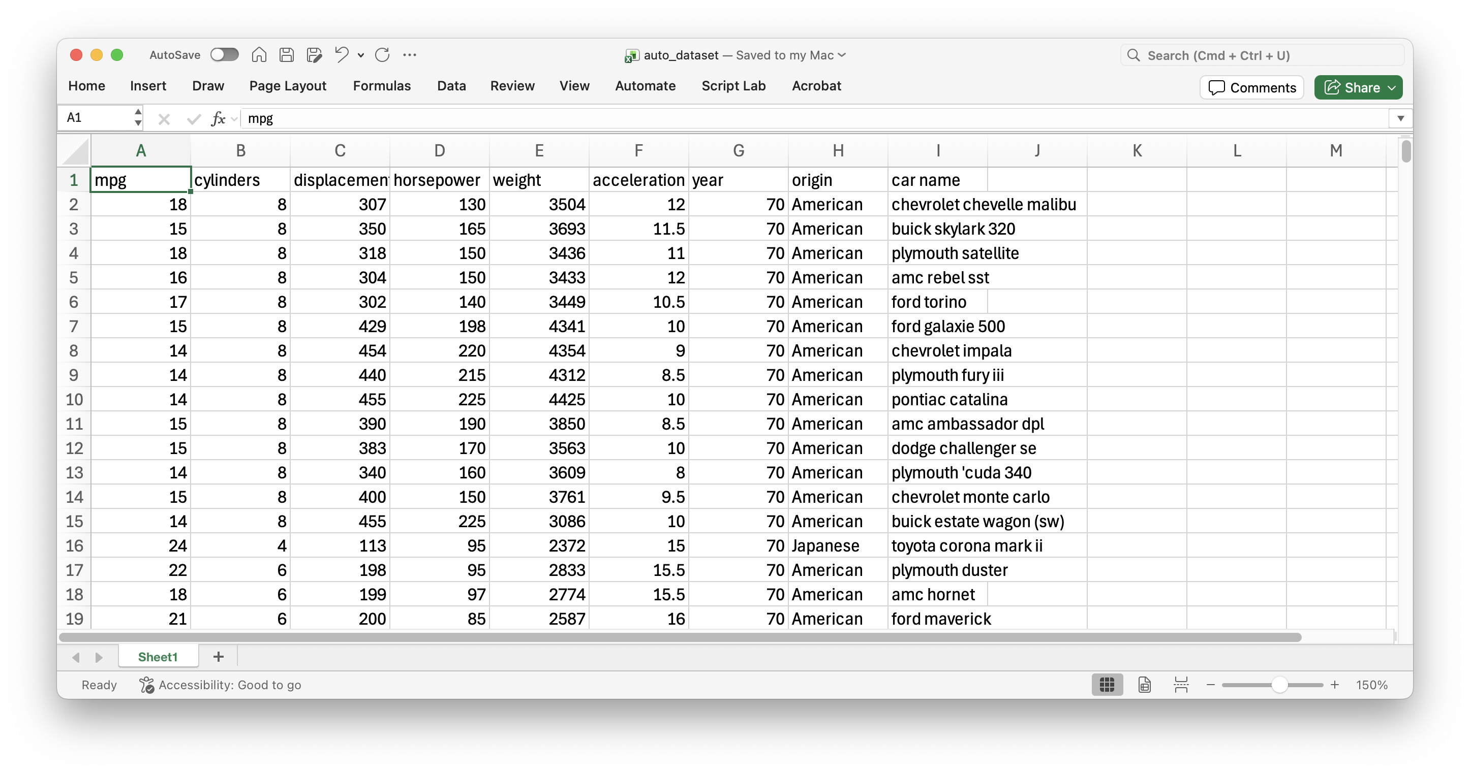 Consider data from 392 cars, including miles per gallon, number of cylinders, horsepower, weight, acceleration, year, origin, among other variables. The data is in the file “auto_dataset.xlsx”.