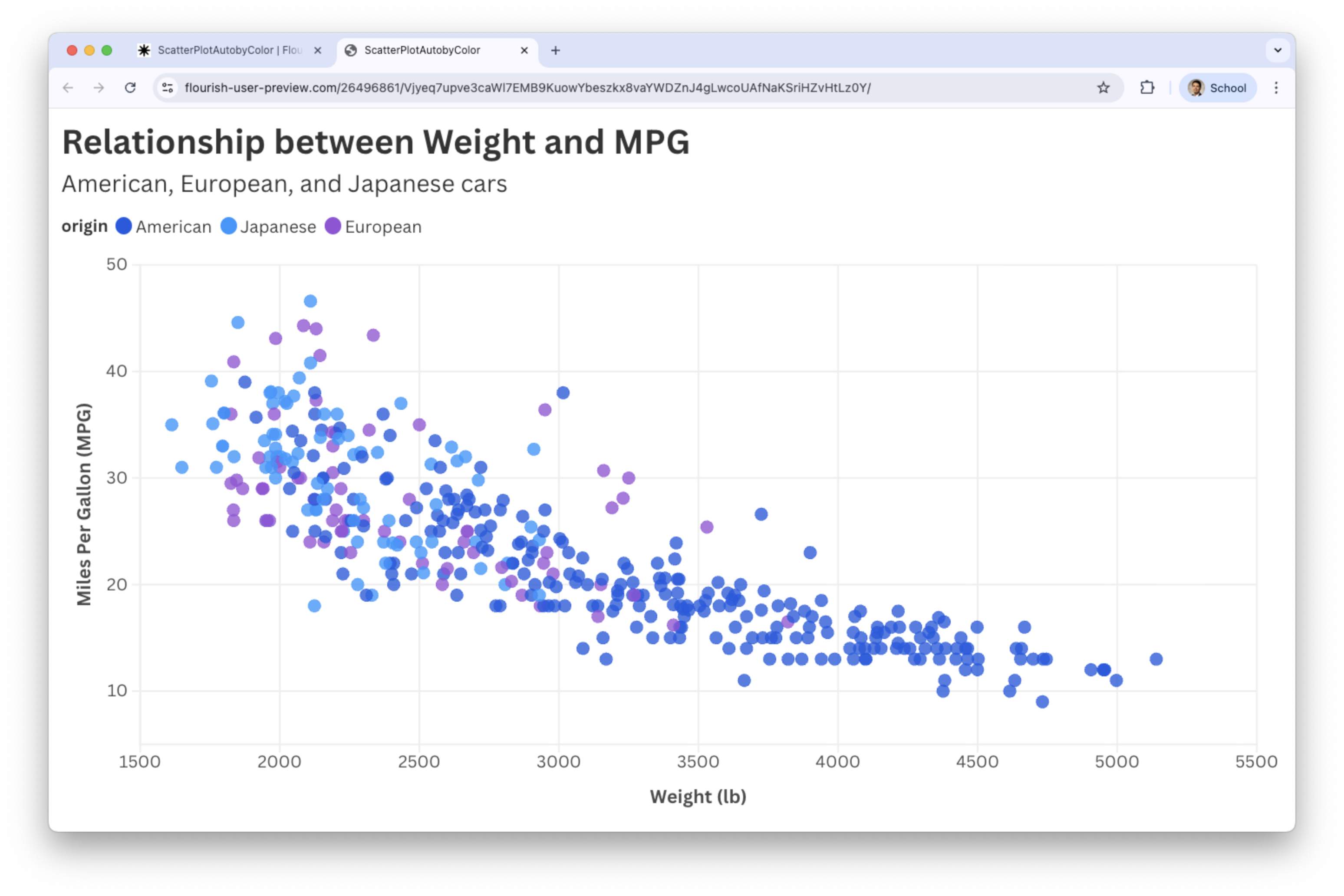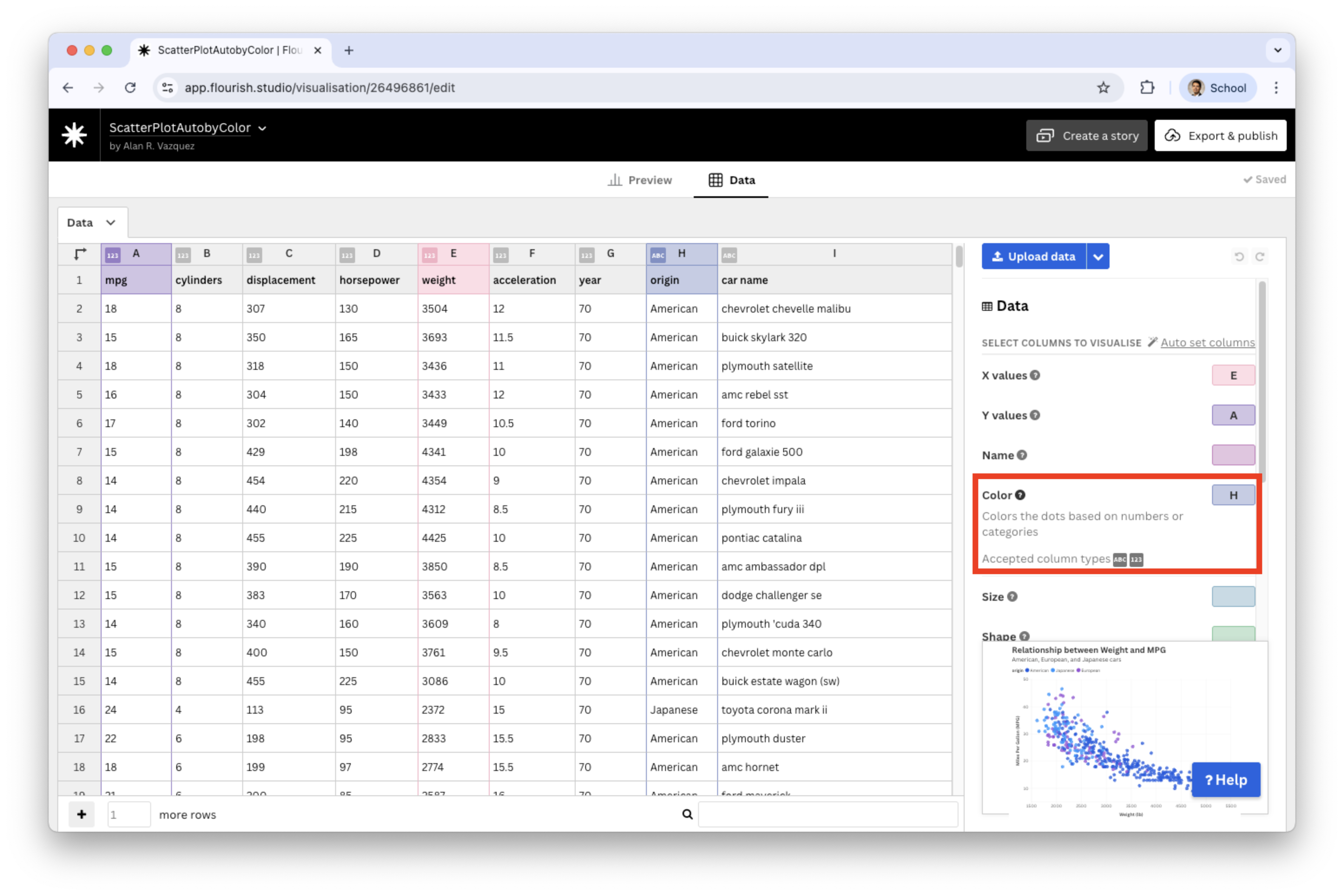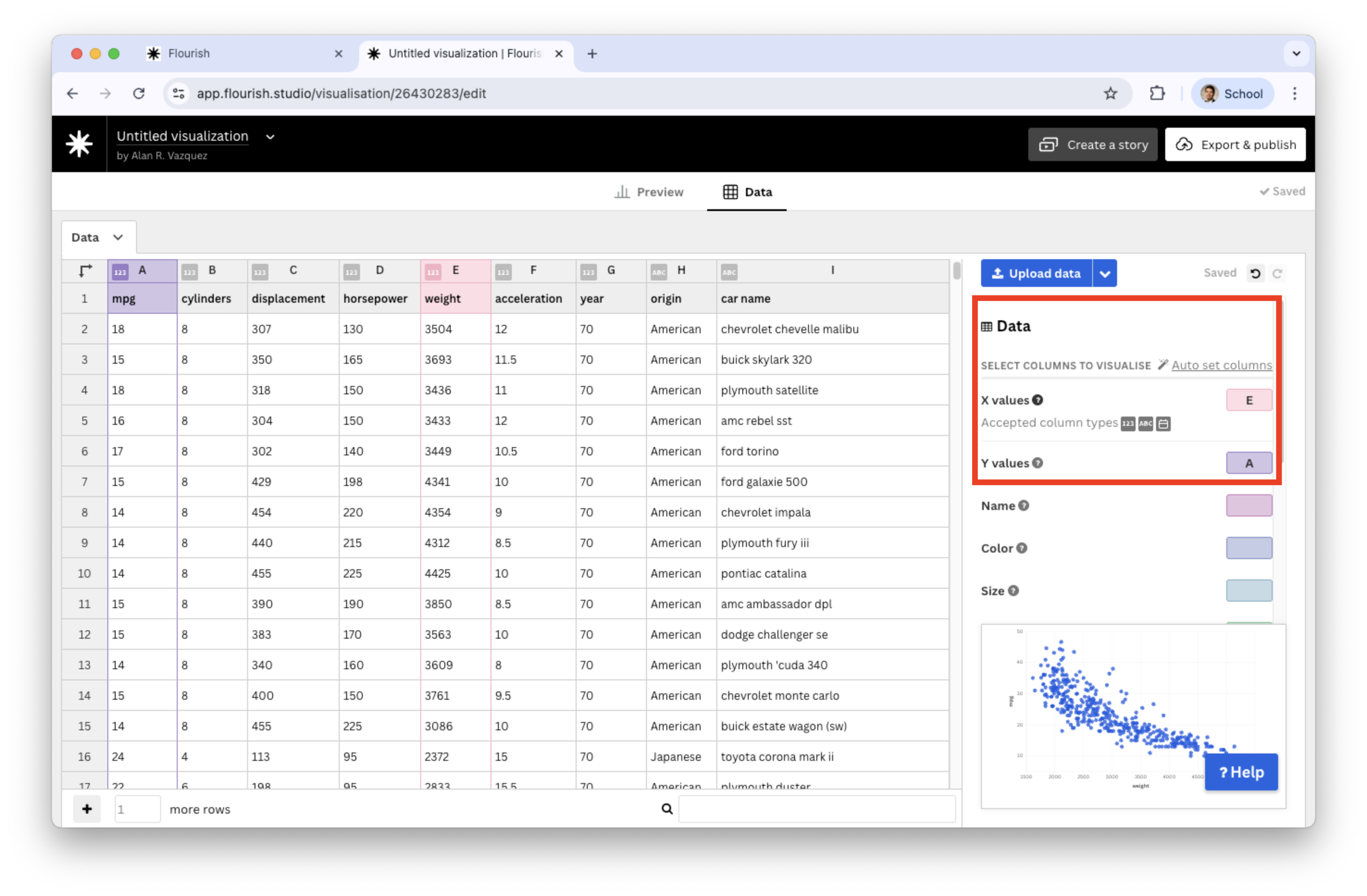 Next, load the “auto_dataset.xlsx” into Flourish. Set the variables under study mpg and weight and assign them to Y values and X values, respectively.
