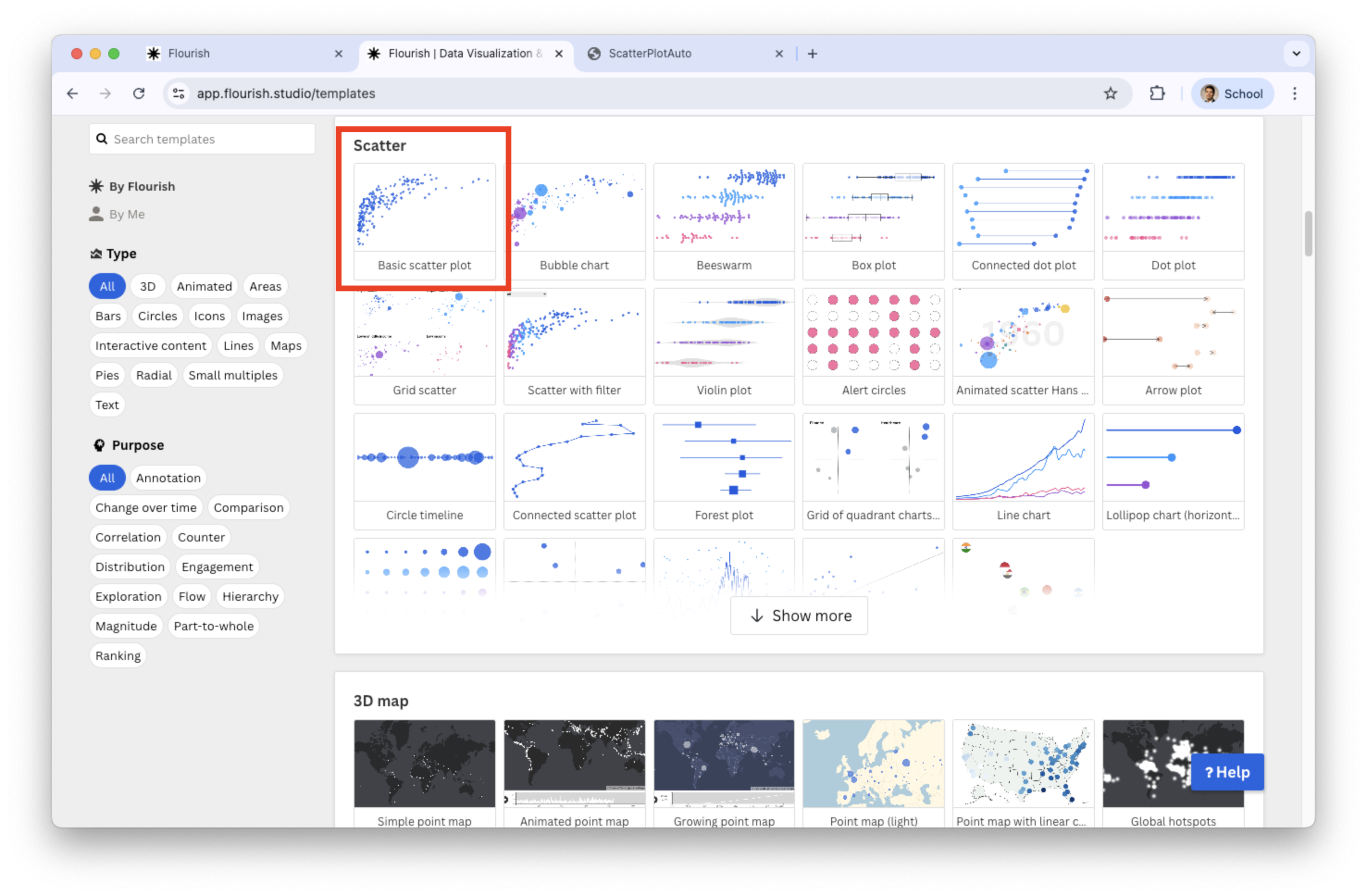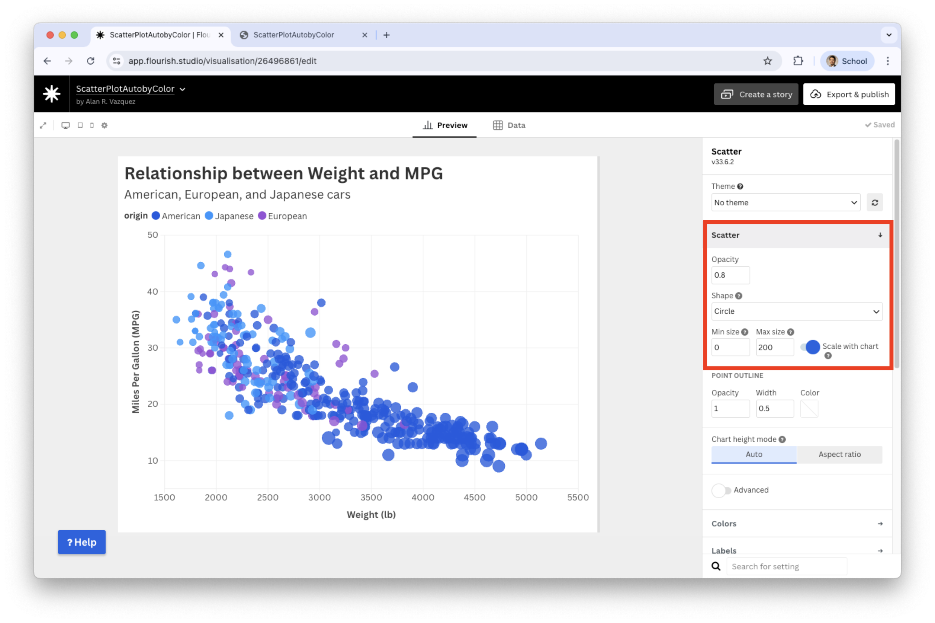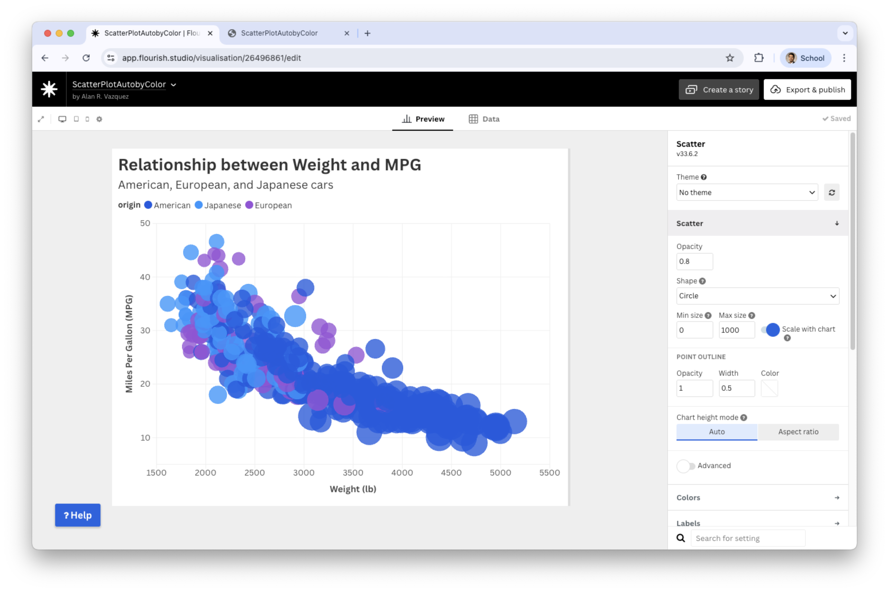 Next, load the “auto_dataset.xlsx” into Flourish. Set the variables under study mpg and weight and assign them to Y values and X values, respectively.