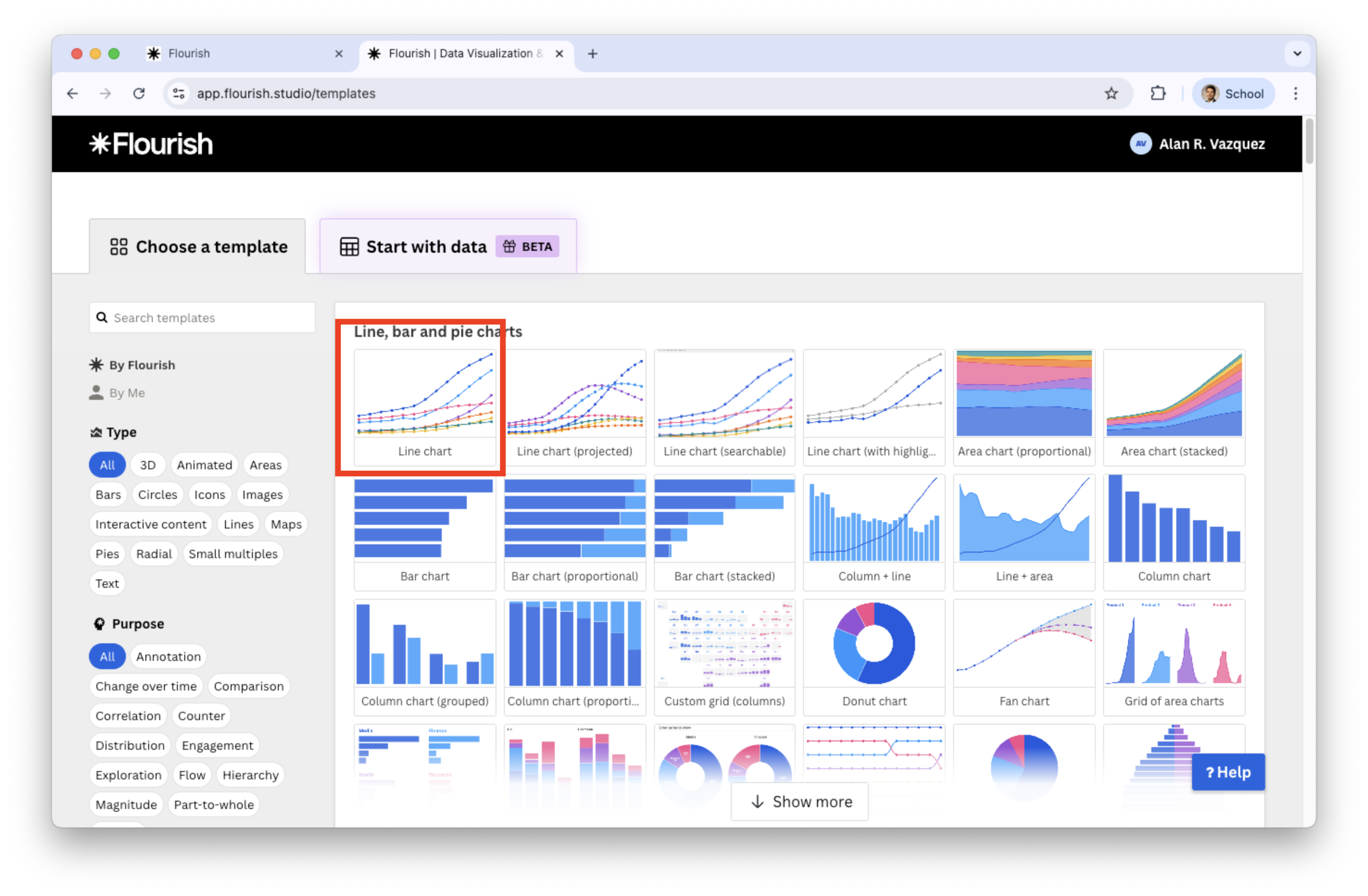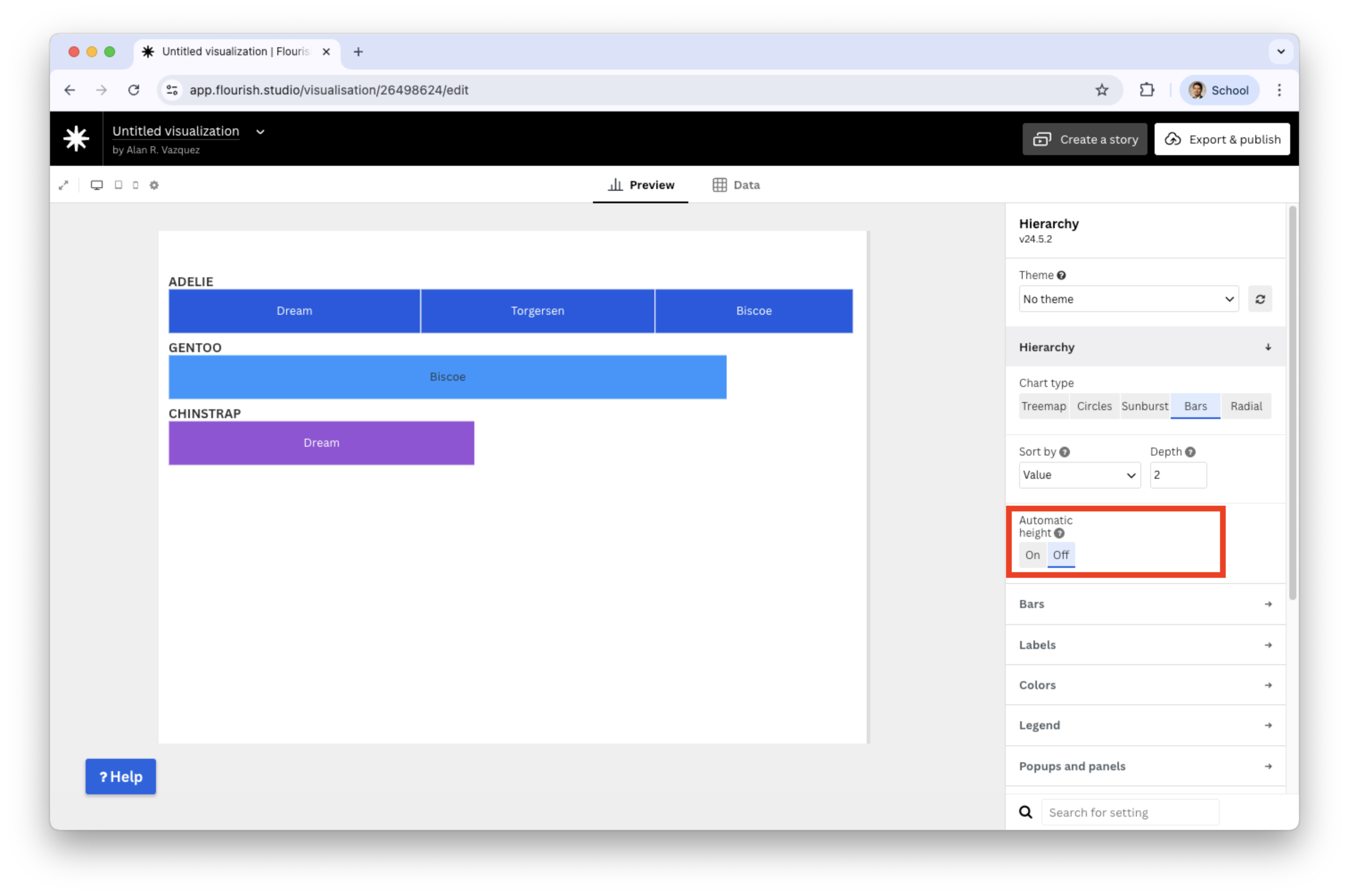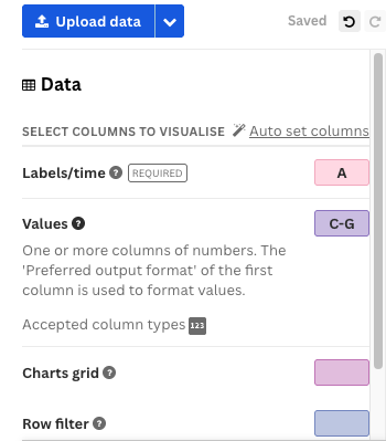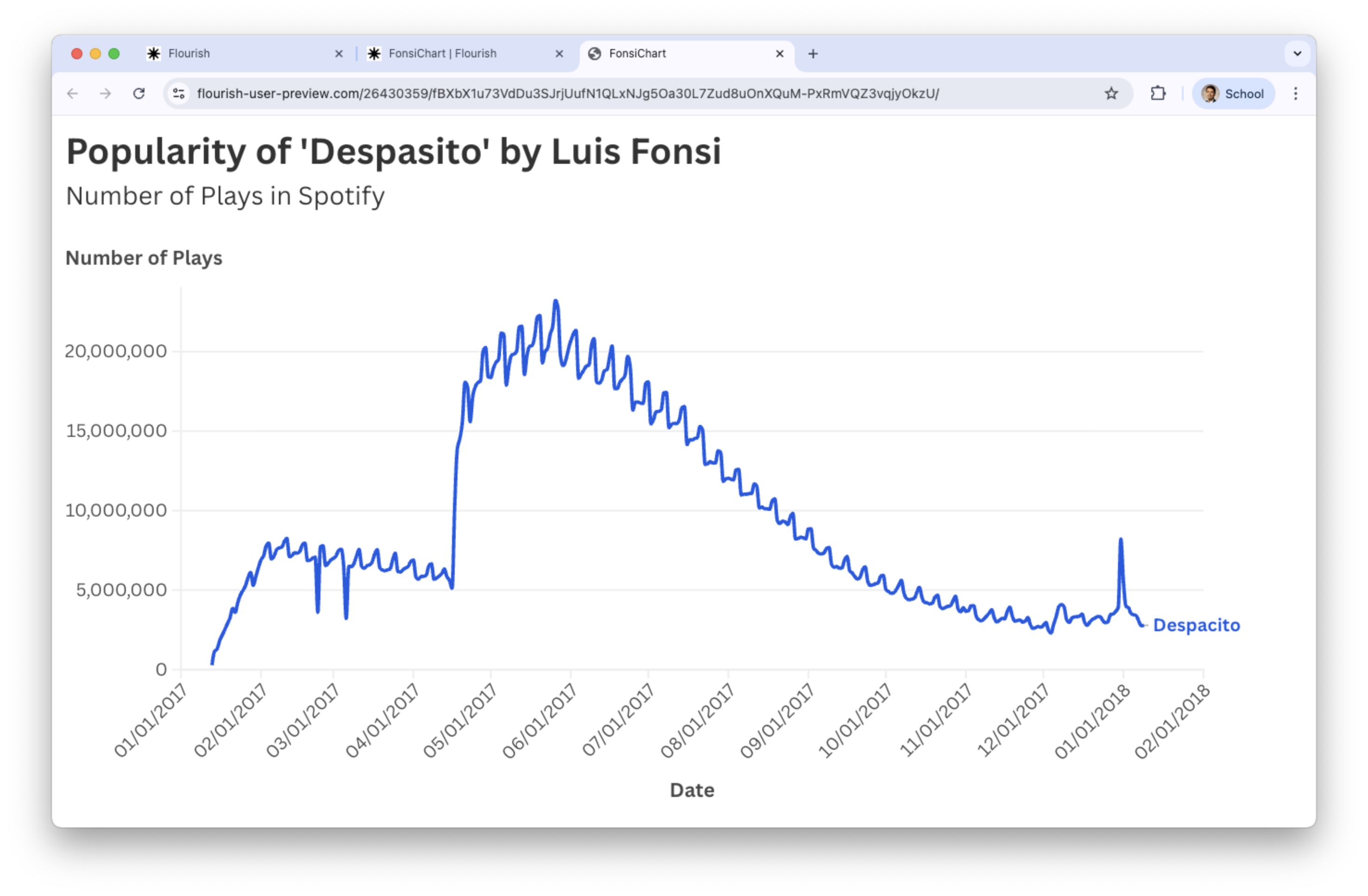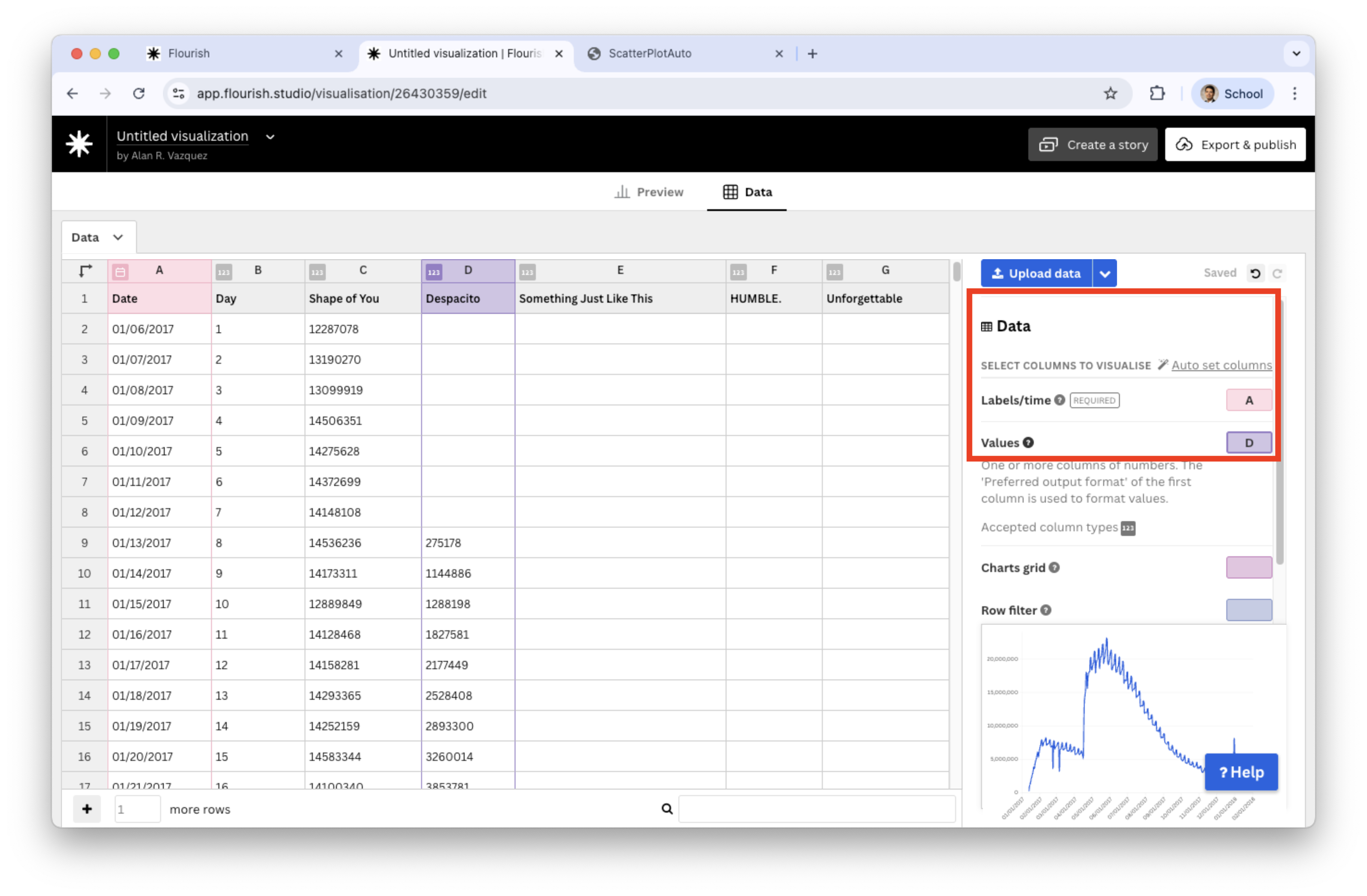 Next, load the “auto_dataset.xlsx” into Flourish. Set the variables under study Date and Despacito and assign them to Labels/time and Values, respectively.
