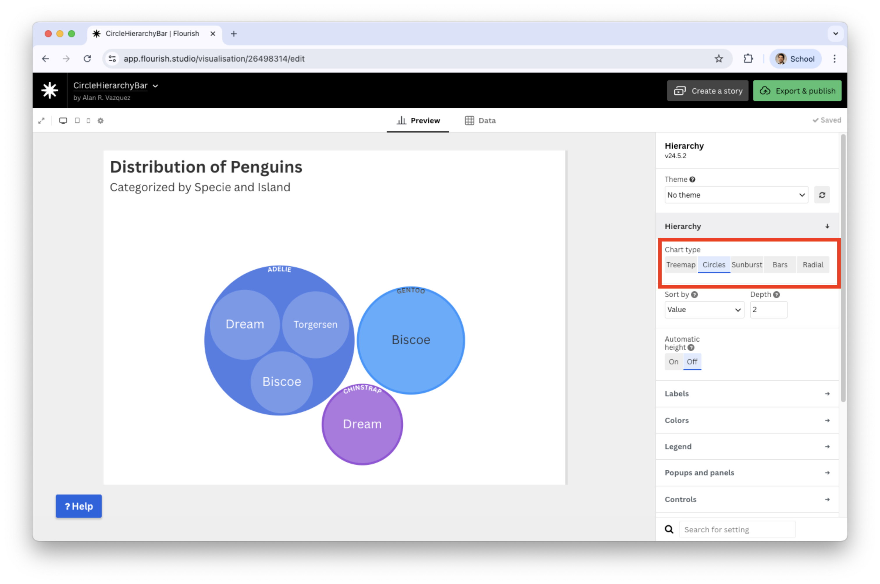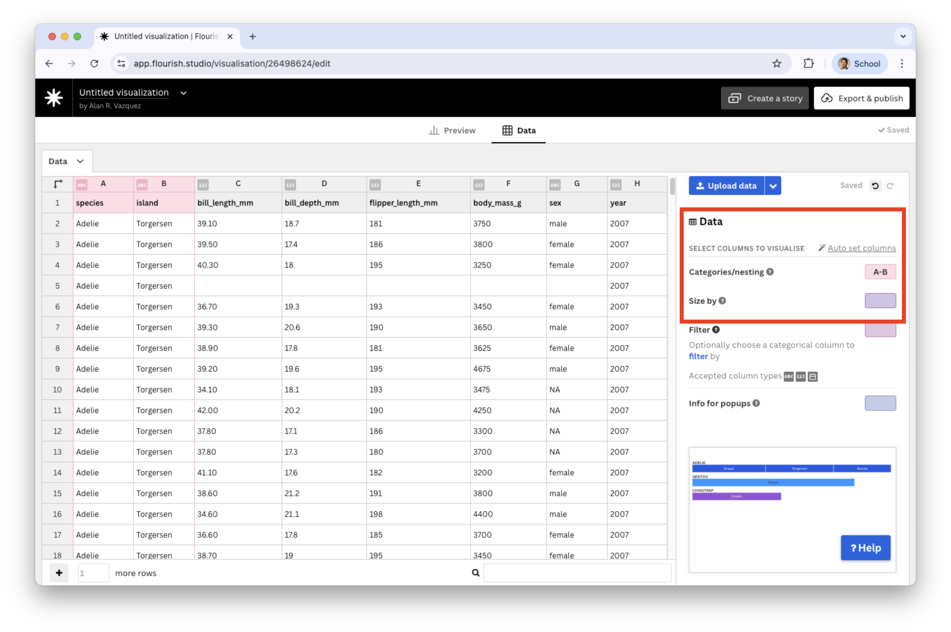 After you load the “penguins.xlsx” data, select two categorical variables in the Categories/nesting section.