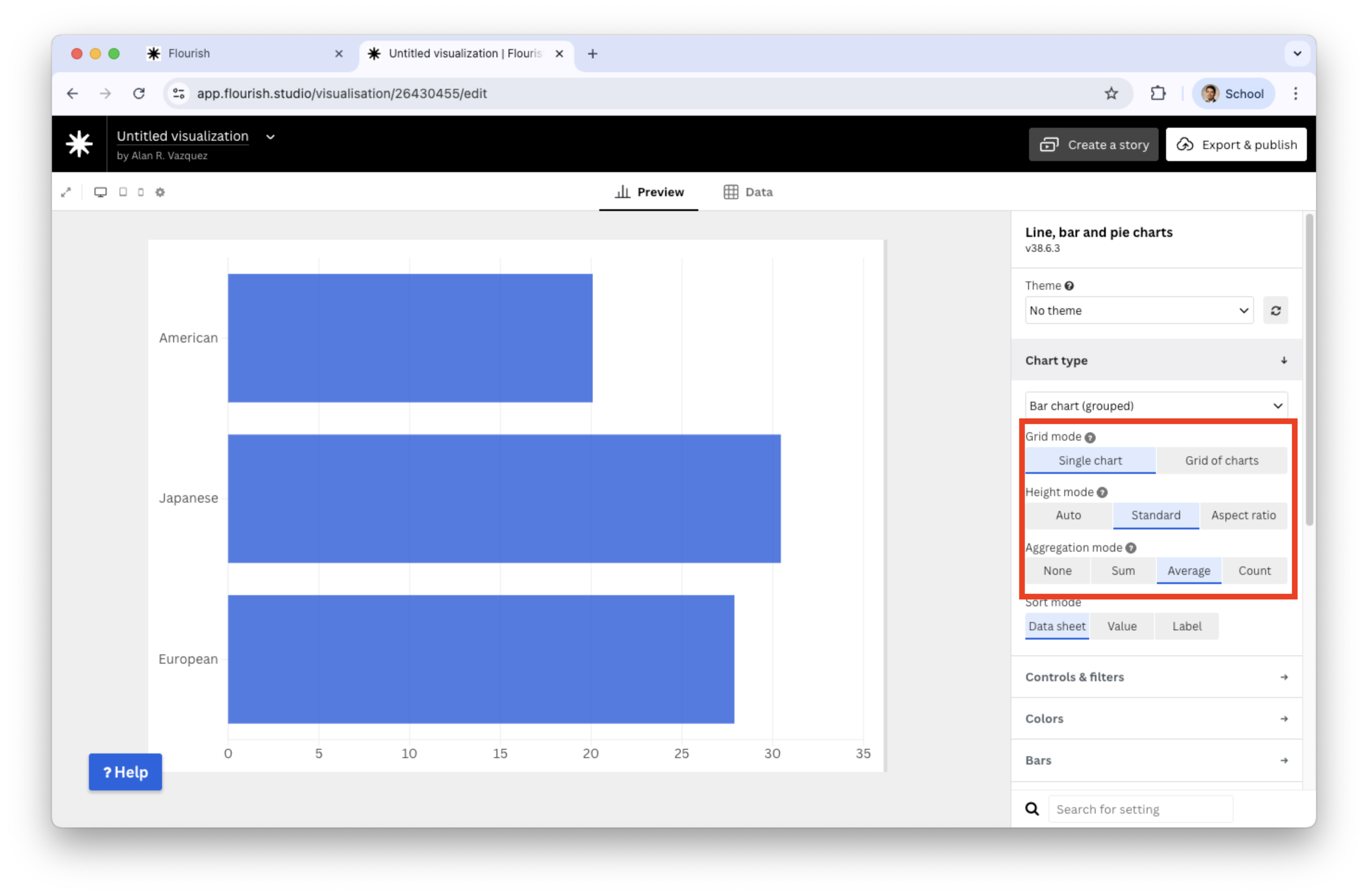 Load the “auto_dataset.xlsx” into Flourish. Set the variables under study origin and mpg and assign them to Labels/time and Values, respectively.