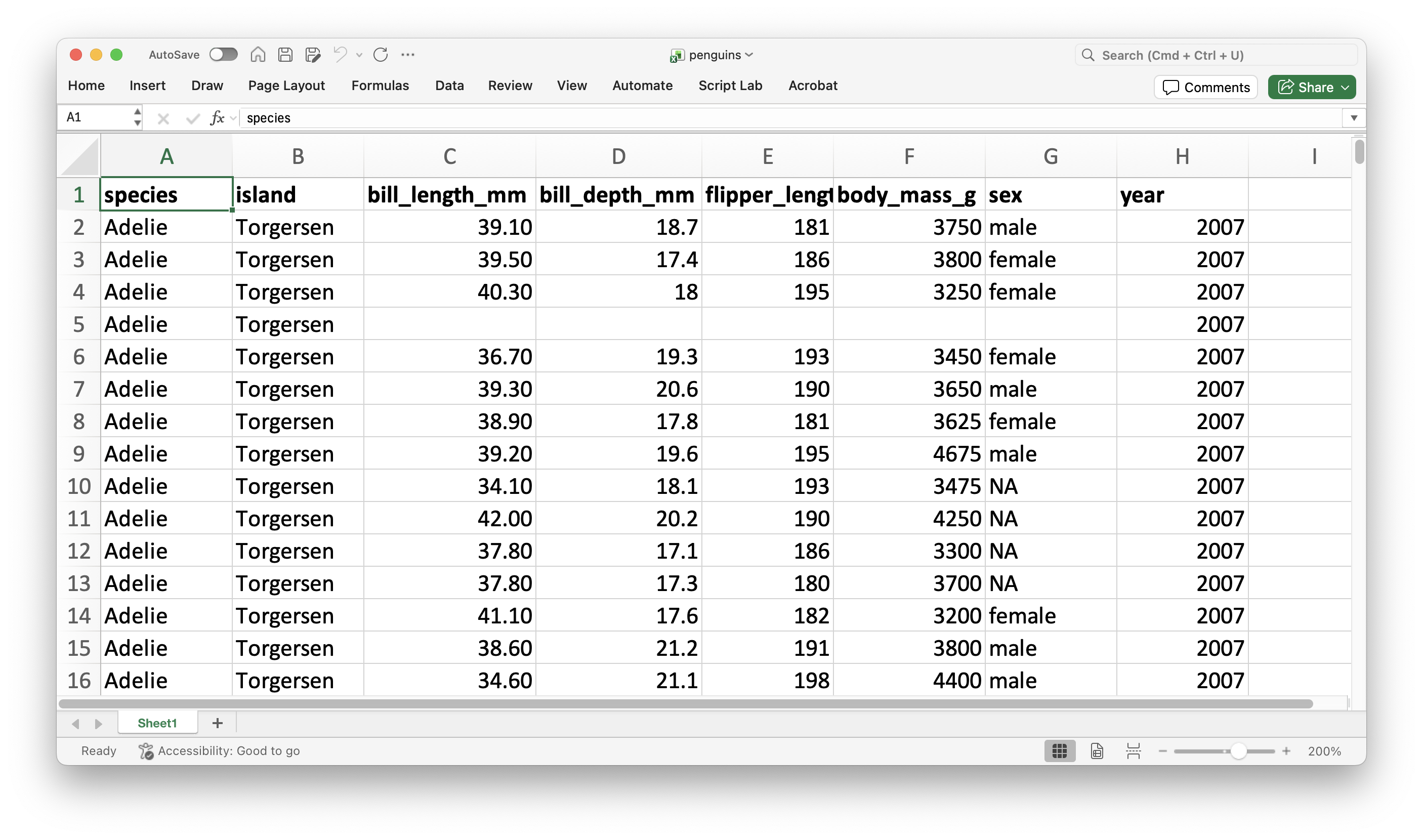 As an example, let’s consider the data in the file “penguins.xlsx” again.