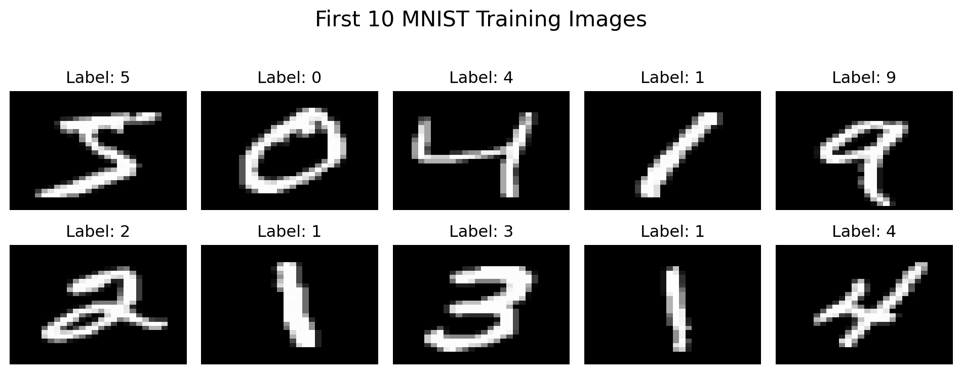 plt.suptitle('First 10 MNIST Training Images', fontsize=16)