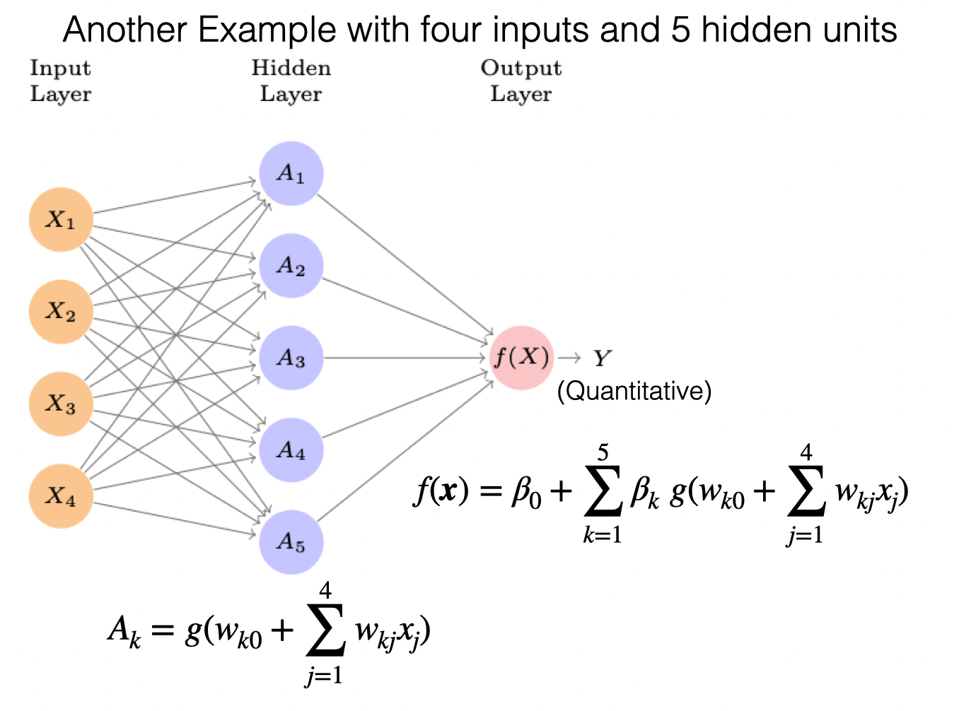 The function \(f(\boldsymbol{X})\) can be represented as a “network” with several interconnected nodes.