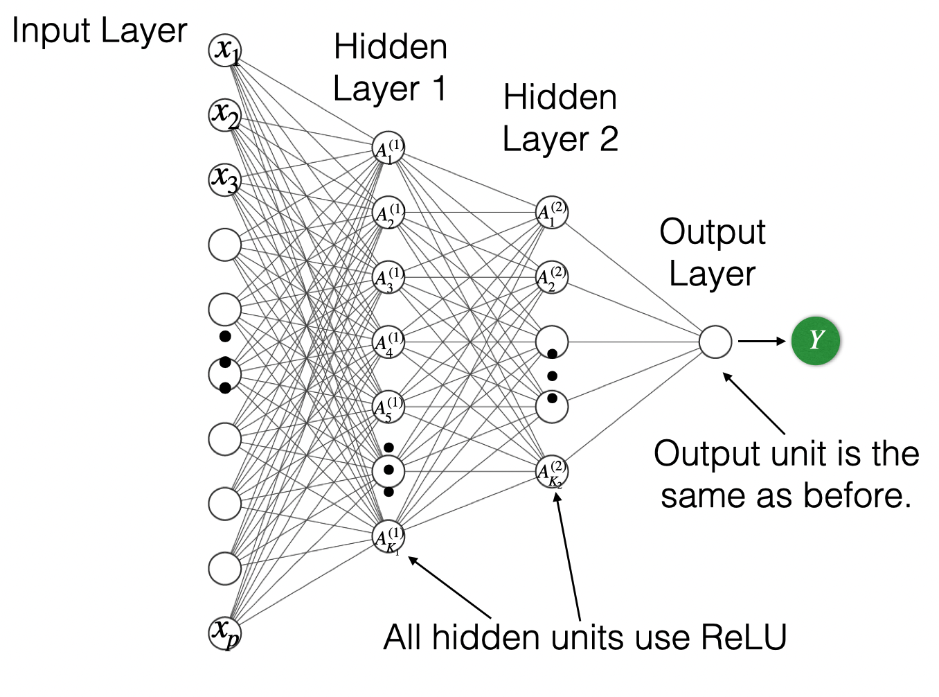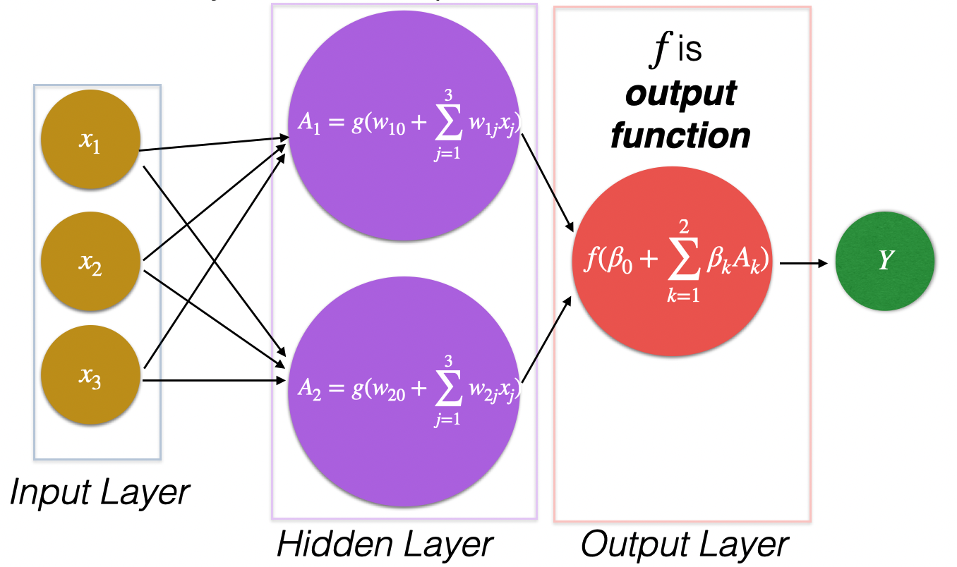 Essentially, a neural network is a nonlinear function \(f(\boldsymbol{X})\) to predict the response \(Y\) using a vector of p inputs, \(\boldsymbol{X} = (X_1, X_2, ..., X_p)\).