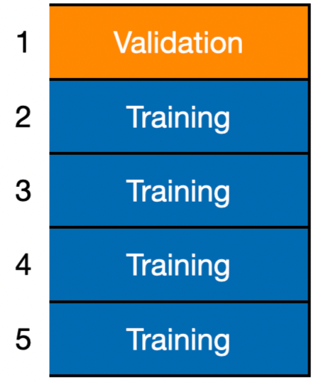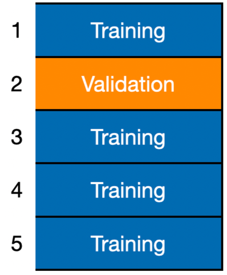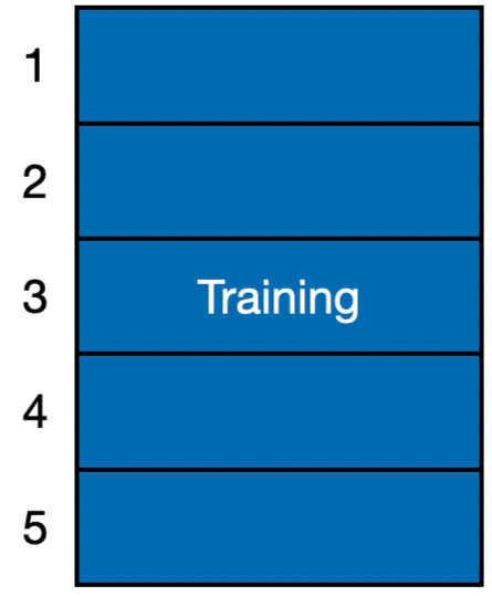 Basic Idea: Divide the training data into \(K\) equally-sized divisions or folds (\(K = 5\) here).