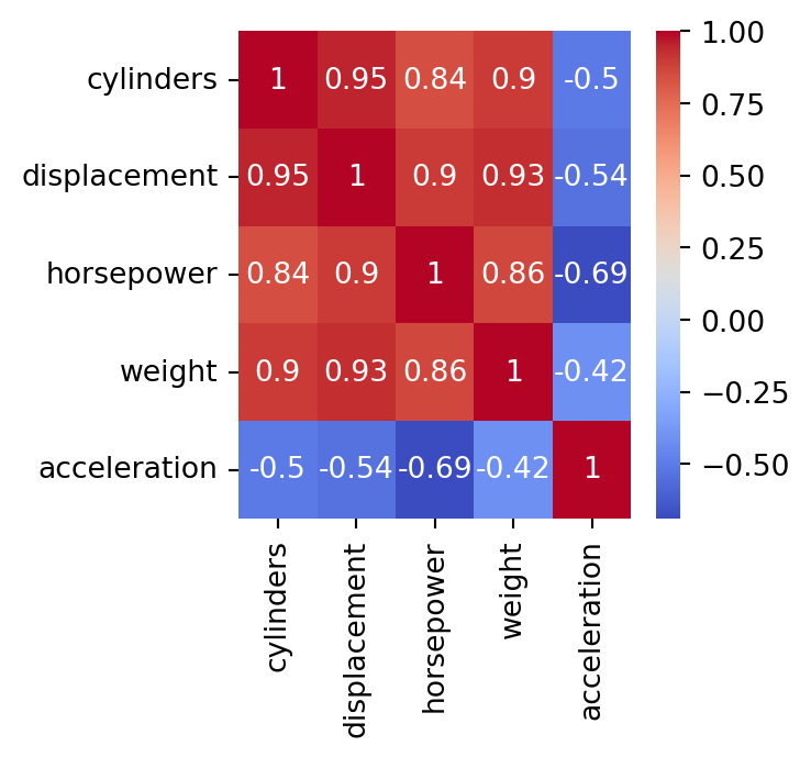 | cylinders | displacement | horsepower | weight | acceleration | |