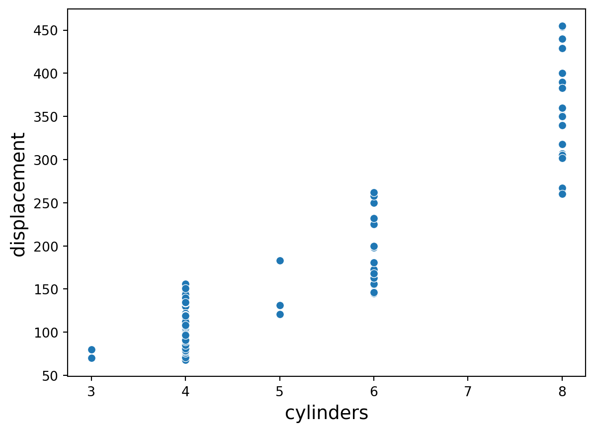 The predictors cylinders and displacement are highly correlated. In fact, their correlation is 0.95.
